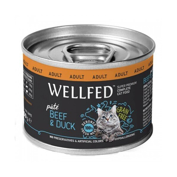 Консерва за котка – Wellfed Говеждо и Патица (12месеца – 7 години) Говеждо и патица със сьомга и масло от таурин. Храна, подходяща за възрастни котки с ниско ниво на магнезий (0,03-0,04%) Цялостно, балансирано хранене с превъзходно качество от 100% прясно задушено месо. Най-примамливото предложение за щастлива котка! Ветеринарно тестван, с вкус, аромат и текстура в съответствие с животинския естествен живот. Съдържа: 70% месо, сърца и черен дроб (50% говеждо месо, 20% патица), бульон 28.8%, минерали 1%, масло от сьомга 0.2%. Протеини: 10.50% Сурова мазнина: 6.40% Сурови фибри: 0.40% Сурова пепел : 2.40% Влага: 80.00% Хранителни добавки – меден сулфат пентахидрат 1mg, Цинк като цинков сулфат, монохидрат 25mg, манган като манган-л-сулфат, монохидрат 1,4mg, йод като калциум джодат 0,75mg, таурин 1500mg. Метаболизируема енергия : 90.3Kcal / 100gr Пастет Без зърна 97.5% месо Без консерванти Без изкуствени цветове Въглехидрати безплатно Хипоалергенна храна Инструкции за ежедневно хранене Тегло на котката – Доза 2-3кг  150гр 3-5кг  200гр 5-7кг  300гр