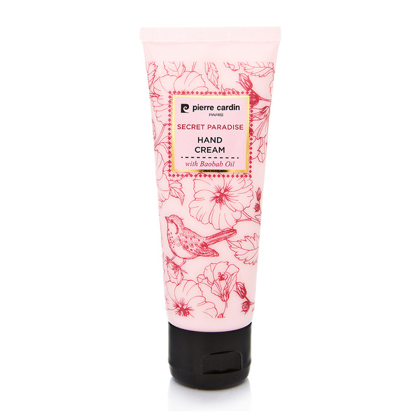 Pierre Cardin Secret Paradise Cream е хидратиращ крем със смес от глицерин и витамин Е. Неговата богата формула се основава на ценното масло от баобаб, което помага за възстановяване на мекотата на кожата. Оставяйки ръцете ви меки и кадифени на допир. Тропическият му аромат ви отвежда в рая.