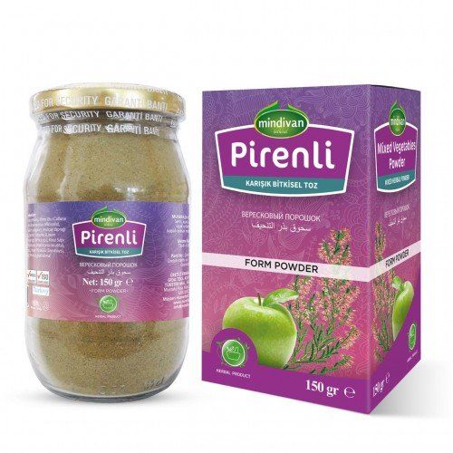 Съставки: Пирен билка, хедър 15%, семена от копър, листа от зелен чай, ленено семе, листа от коприва, черешови дръжки, лайка, мащерка, царевична коса, листа от авокадо. Начин на употреба: Да не се приемат повече от 3 чаени лъжици на ден разтворен във вода или кисело мляко. Продуктът не е подходящ за деца под 3 години.