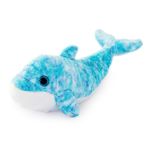 Плюшен делфин Сами е със стъклени очи в син преливащ се цвят.