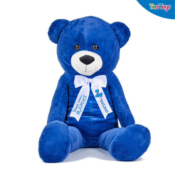 Плюшено мече в синьо с надписана панделка е прекрасно.