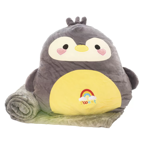 Чудесна комбинация от мека играчка, която може да се ползва и като възглавничка и нежно одеалце, скрито в играчката.
