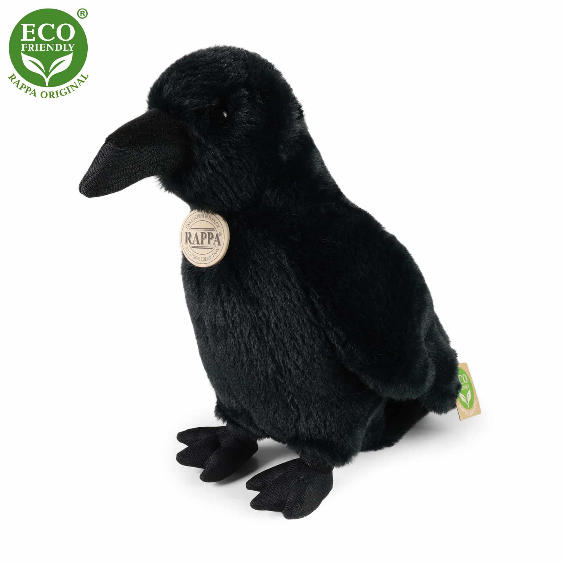 Плюшеният гарван е ръчно ушит от висококачествен, мек плюш, което го прави да изглежда реалистичен. ТОй е с размери: 25 см. Част е от ексклузивната колекция плюшени играчки RAPPA. Решихме да тръгнем по зеления път с най-малко натоварване на околната среда – ЕКОЛОГИЧНИЯ път. Какво всъщност означава ЕКОЛОГИЧЕН? Пълнежът на плюшената играчка е от рециклирани PET бутилки. Този материал е напълно безопасен, неразличим на допир от стандартния пълнеж и напълно сертифициран за безопасност и на най-малките.