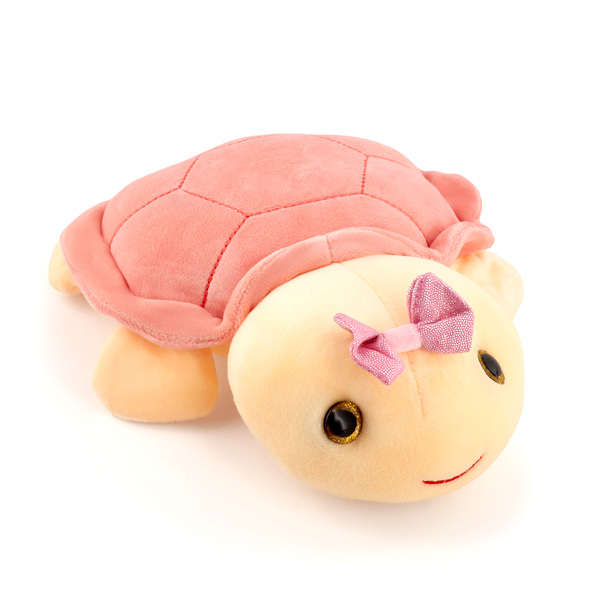 Плюшената костенурка с розова панделка от Tea Toys е много мека и нежна на допир.