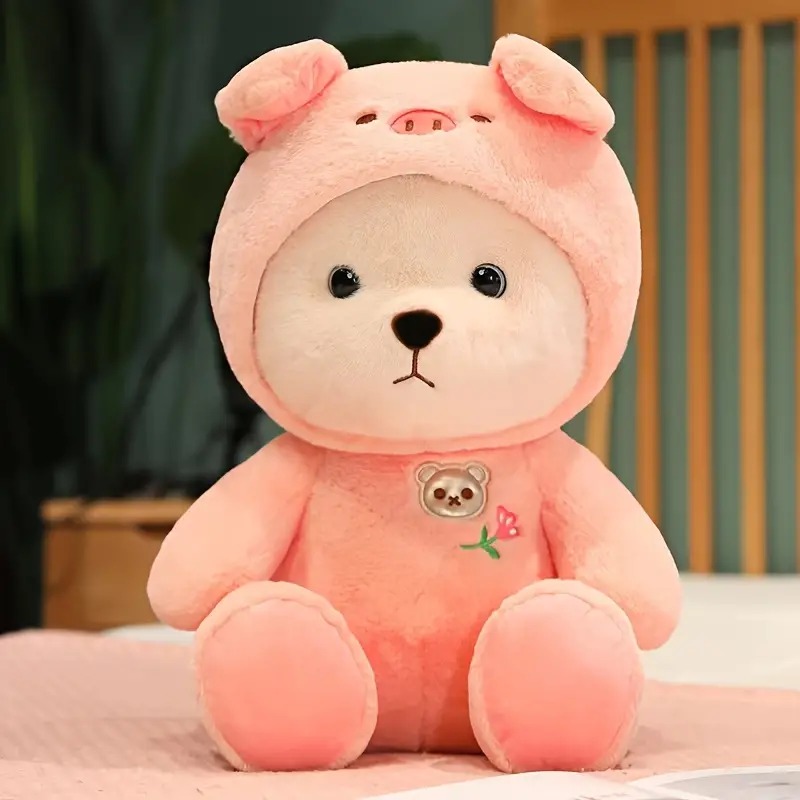 Плюшено мече в костюм на прасенце от TeaToys е много меко и подходящо за мачкане.Размер: 23 смСъстав: текстил, пълнеж и багрила безвредни за здравето, 100% полиестер.Отговаря на европейския стандарт за качество EN71.