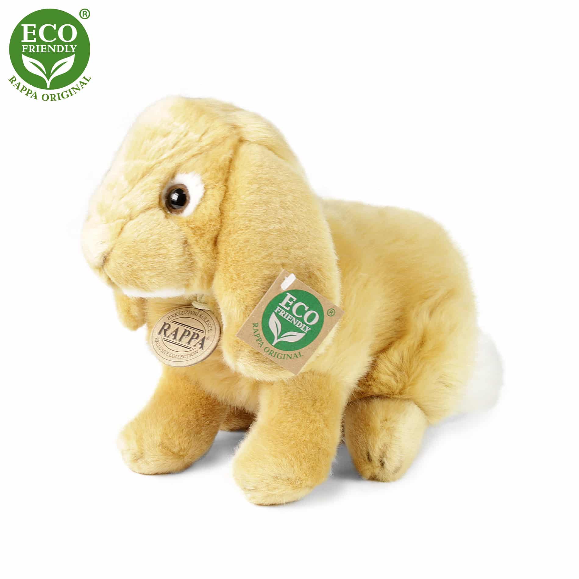 Прекрасно плюшено зайче, в бежов цвят, с размер 24 см, част от ексклузивната колекция плюшени играчки RAPPA. Какво всъщност означава ЕКОЛОГИЧЕН? Пълнежът на плюшената играчка е от рециклирани PET бутилки. Този материал е напълно безопасен, неразличим на допир от стандартния пълнеж и напълно сертифициран за безопасност и на най-малките. Решихме да тръгнем по зеления път с най-малко натоварване на околната среда – ЕКОЛОГИЧНИЯ път. Възраст: 0+