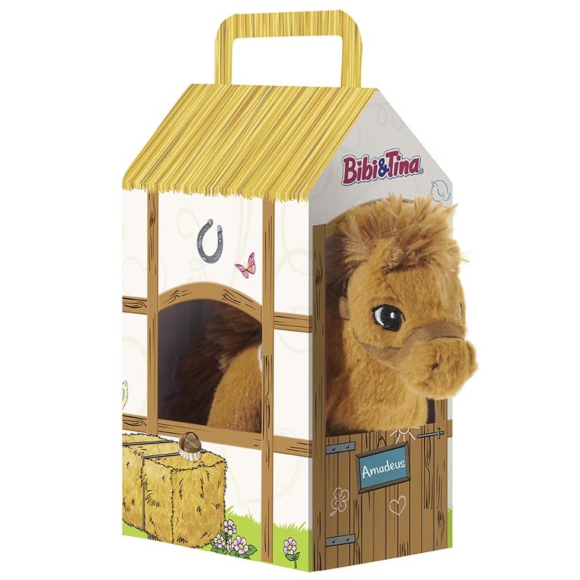 Кончето Амадеус е изработено от къс мек вълнен материал в изправено положение. Има кафява грива и големи, бродирани очи. Седлото и юздата са бродирани. Кончето е меко пълнено. Има и декоративна картонена конюшня, така че Amadeus винаги да дойде с вас или да се прибере да похапне.