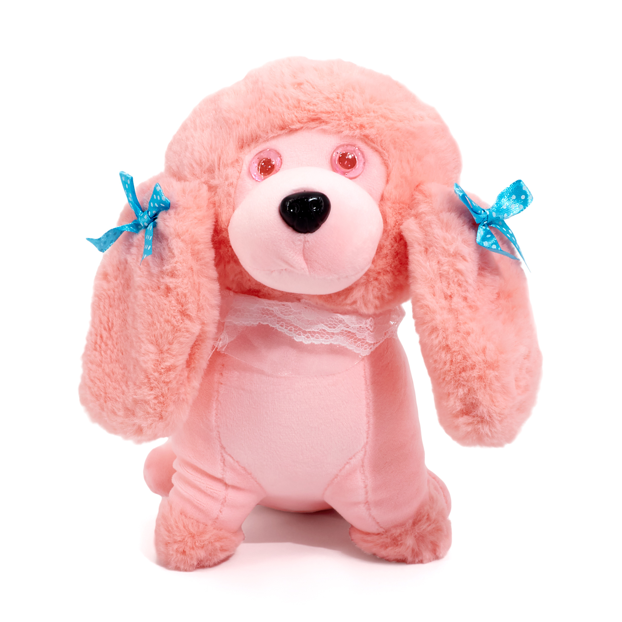 Плюшено куче пудел в розово е очарователно.Много нежно и меко на допир.Има красиви стъклени очи, които придават още по-изящен вид на играчката.Подходящо за гушкане и игра за деца над 3 год.Размер: 22 см Състав: текстил, пълнеж и багрила безвредни за здравето, 100% полиестер.Отговаря на европейския стандарт за качество EN71.