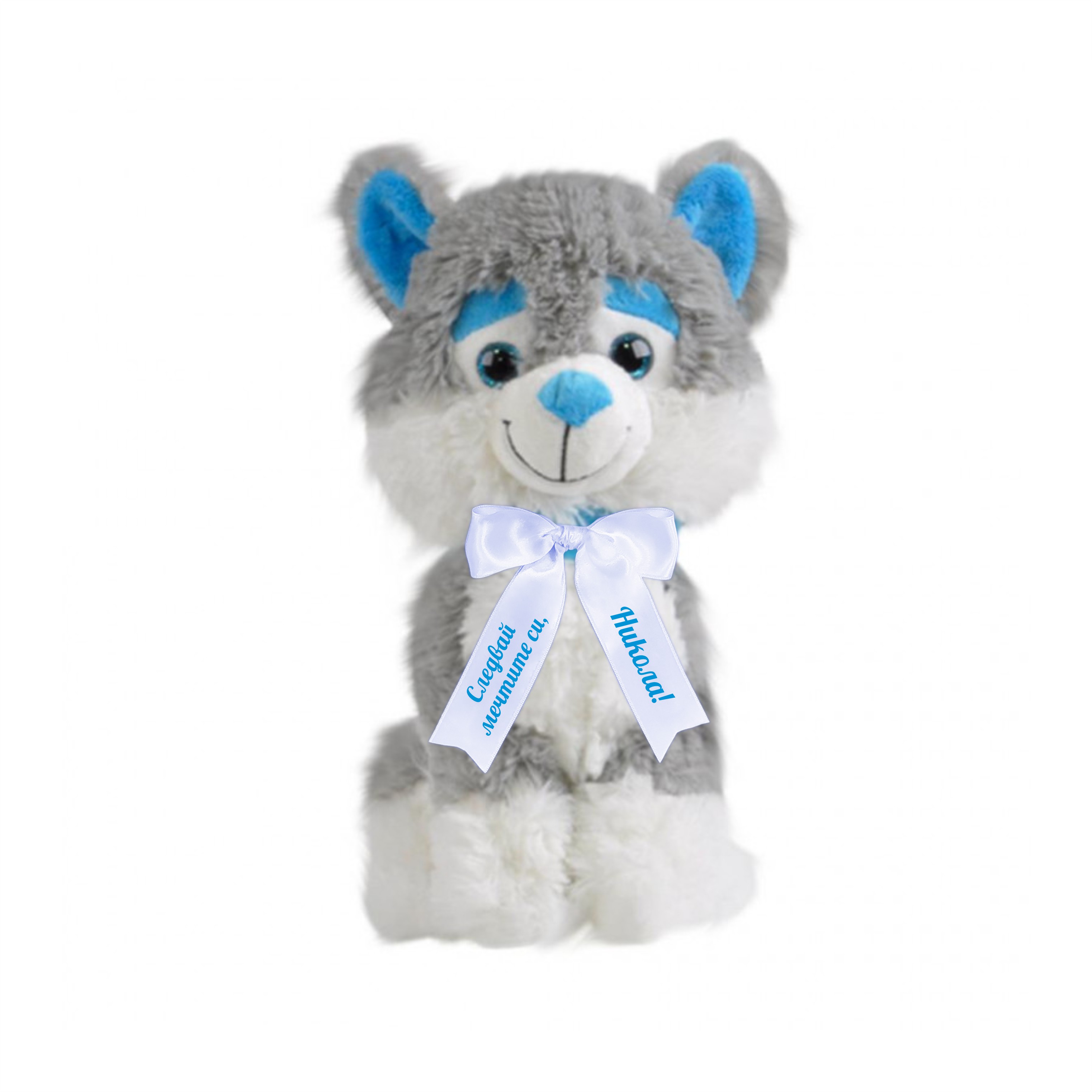 Плюшено куче с надписана панделка е очарователно.Надписът е по избор на клиента.Може да бъде за рожден ден, за имен ден , за кръщене, за влюбени и даже без повод.Изключително нежно и меко на допир.Изработено е от високачествен копринен плюш, то ще очарова всеки, който го гушне.Размер: 28 см.Състав: текстил, пълнеж и багрила безвредни за здравето, 100% полиестер.Отговаря на европейския стандарт за качество EN71.