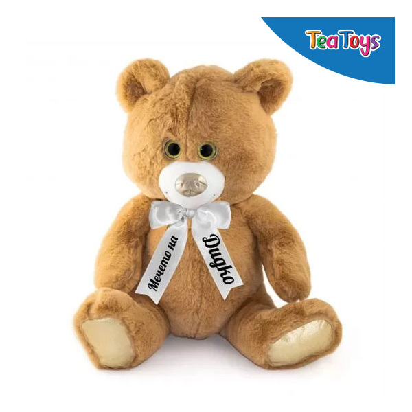 Плюшено мече с надпис по ваш избор.Размер: 50 см.Състав: текстил, пълнеж и багрила безвредни за здравето, 100% полиестер.Отговаря на европейския стандарт за качество EN71.