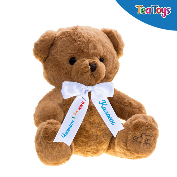 Плюшено мече с надписана панделка е нежно и меко на допир.