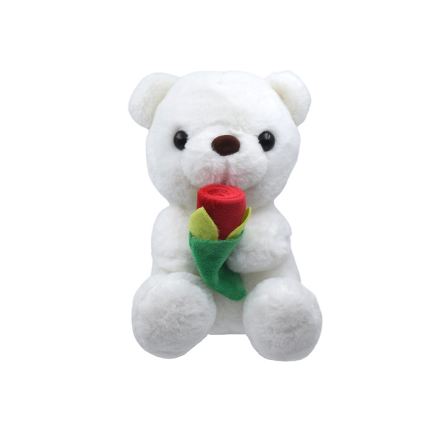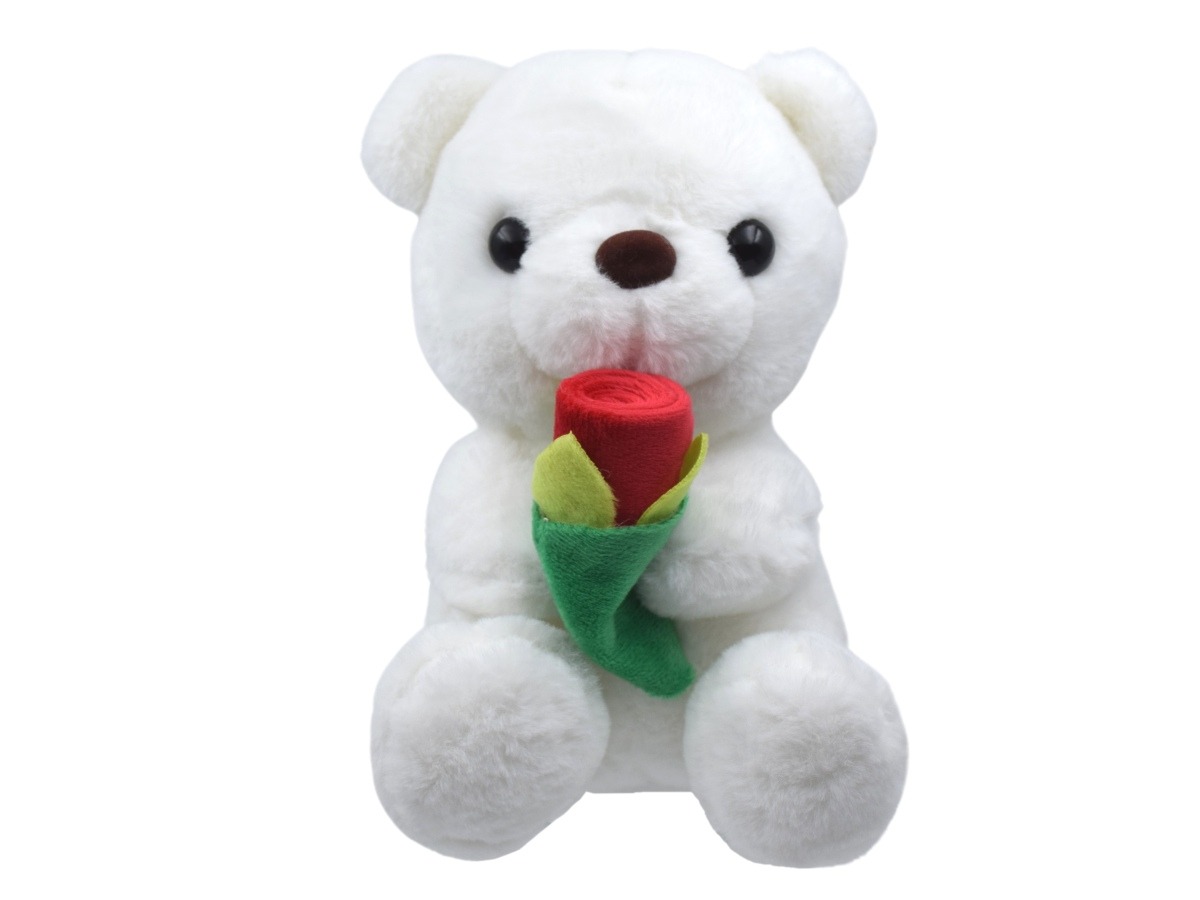Плюшено мече с роза в бяло е очарователно.Много меко и нежно на допир.Мисията му е да усмихне и зарадва някой!Размер: 25 смСъстав: текстил, пълнеж и багрила безвредни за здравето, 100% полиестер.Отговаря на европейския стандарт за качество EN71.