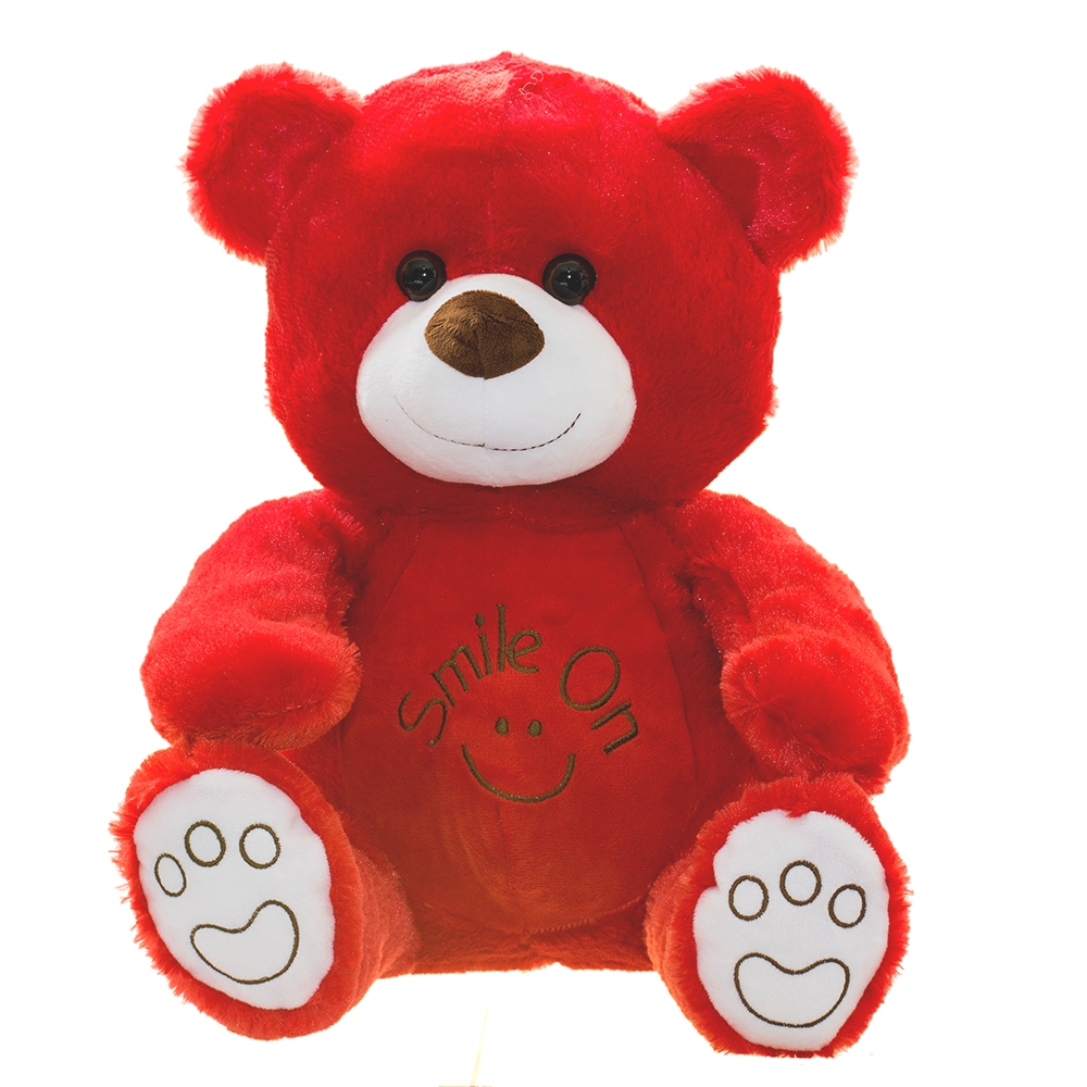 Плюшено мече с надпис "Smile on" в червено ще ви очарова!Изработено е от висококачествена материя, изключително нежно и меко на допир.Класически вариант на плюшено мече, подходящо за подарък за всякакъв повод!Размер: 40 смСъстав: текстил, пълнеж и багрила безвредни за здравето, 100% полиестер.Отговаря на европейския стандарт за качество EN71.