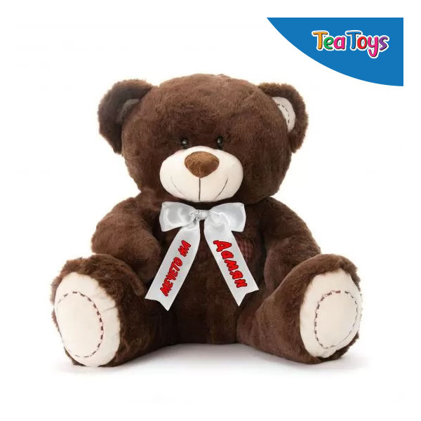 Плюшено мече в кафяво с надписана панделка е нежно и меко на допир.Прекрасен избор за подарък за всякакъв повод.Надписът е по ваш избор!Усмехнете вашето дете, любим човек или приятел!Подходящ за гушкане и игра.Размер: 50 см.Състав: текстил, пълнеж и багрила безвредни за здравето, 100% полиестер.Отговаря на европейския стандарт за качество EN71.