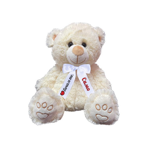 Плюшено мече в бяло с надписана панделка е прекрасен подарък за рожден ден на малко момченце.