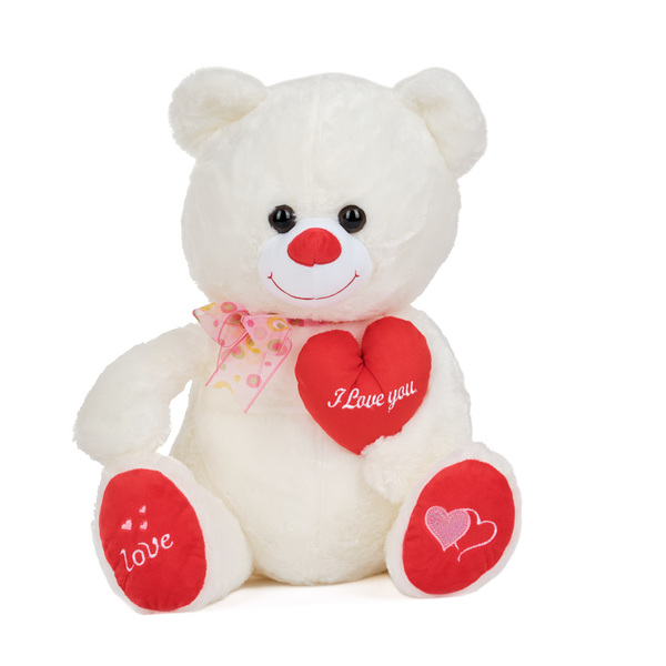 Плюшено мече за влюбени в бяло е прекрасен подарък за любимата.Със сигурност ще получите голяма прегръдка!Размер: 47 смСъстав: текстил, пълнеж и багрила безвредни за здравето, 100% полиестер.Отговаря на европейския стандарт за качество EN 71.