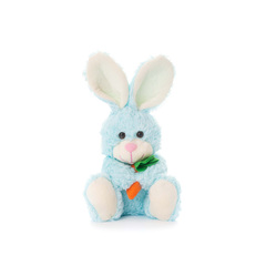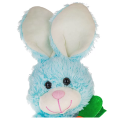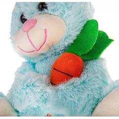Плюшено зайче с морков Чочо е синьо.
