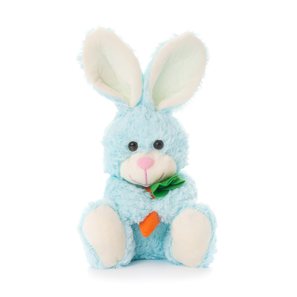 Плюшено зайче с морков Чочо е синьо.