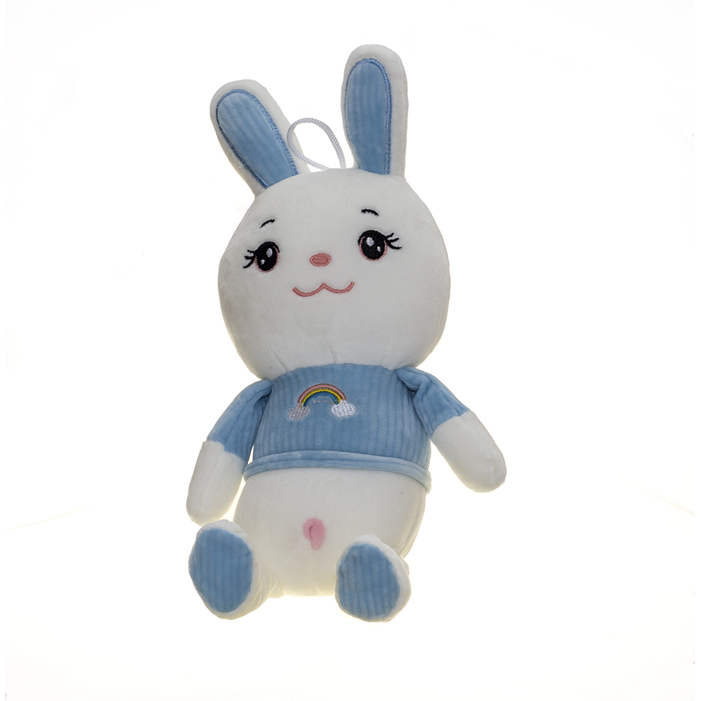 Плюшено зайче със синя тениска е очарователно!Нежно и меко на допир, плюшеното зайче е чудесен подарък за Вашето дете.Размер: 30 см.Състав: текстил, пълнеж и багрила безвредни за здравето, 100% полиестер.Отговаря на европейския стандарт за качество EN71.