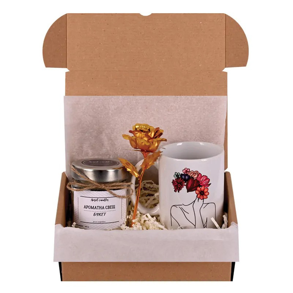 Подаръчен комплект "Честит Празник" с ароматна свещ "Букет", чаша и златна роза.