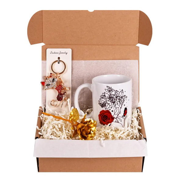 Подаръчен комплект - Честит Празник с чаша, златна роза и метален ключодържател