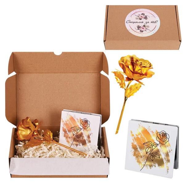 Подаръчен комплект "Честит Празник" със сгъваемо джобно огледало и златна роза.