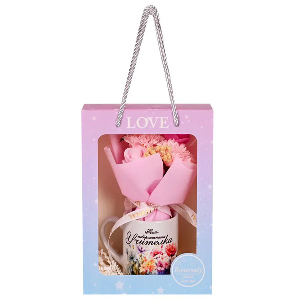 Подаръчен комплект "Най-невероятната учителка" букет от вечни цветя и керамична чаша в луксозна кутия.