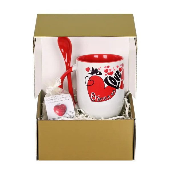 Подаръчен комплект "Обичам те" с чаша, лъжичка и чаена свещ с изображение.