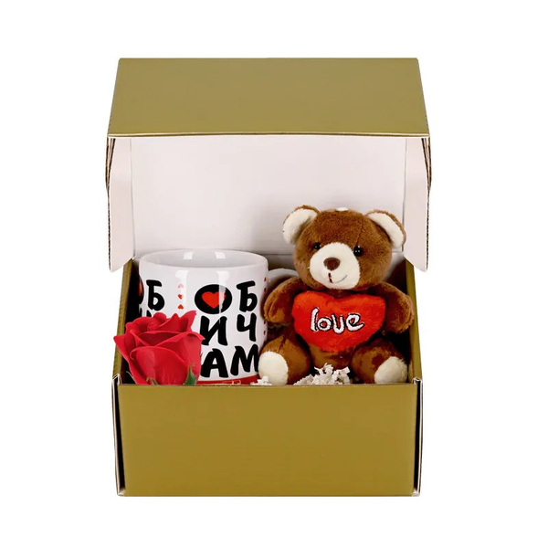 Подаръчен комплект "Обичам те" с чаша, плюшено мече и сапунена роза.