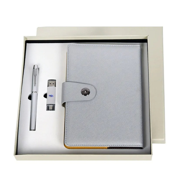 Стилен подаръчен комплект с химикал, бележник и USB + MicroUSB в луксозна кутия.