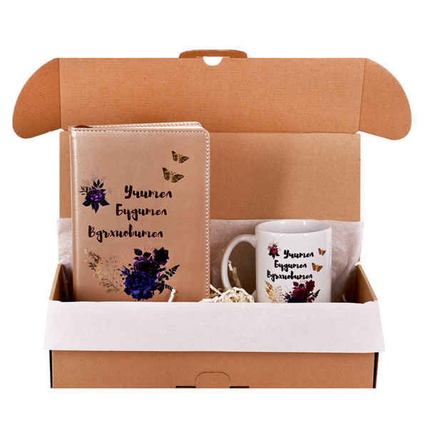 Подаръчен комплект "Учител, Будител, Вдъхновител" с бележник и чаша.