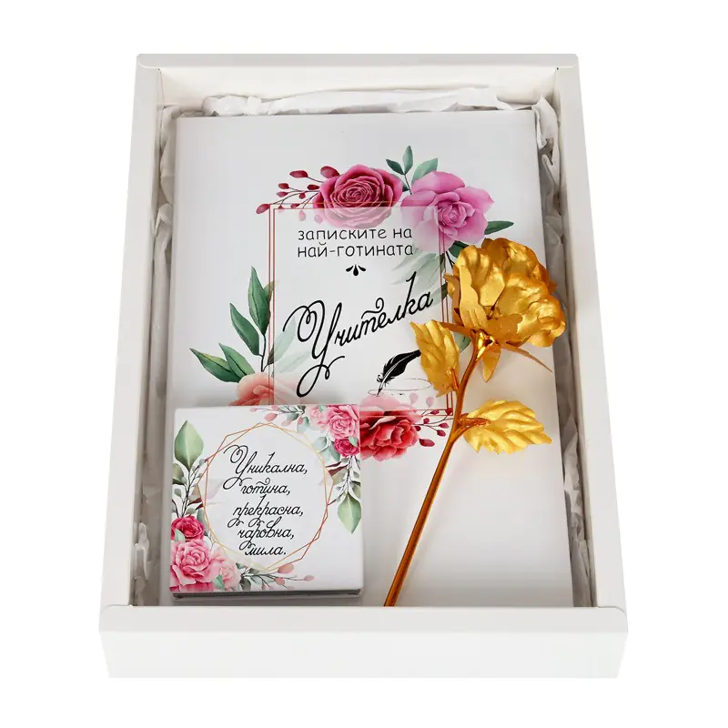 Подаръчен комплект за Учителка - златна роза, огледало и бележник в кутия.