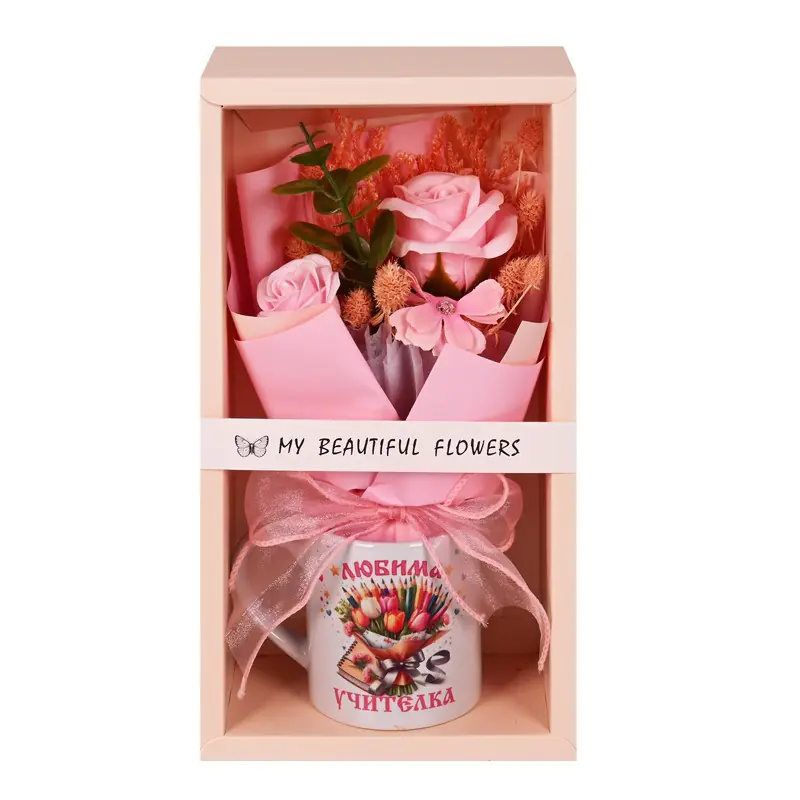 Комплектът включва чаша с букет сапунени рози.