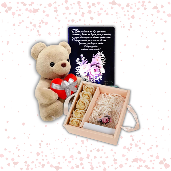 Подаръчен комплект за 8 март - плюшено мече и интериорна 3D - LED лампа с послание и сапунени рози.