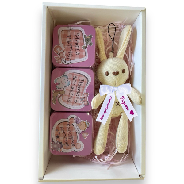 Подаръчен комплект за бебе момиче - меко зайче с персонален надпис.