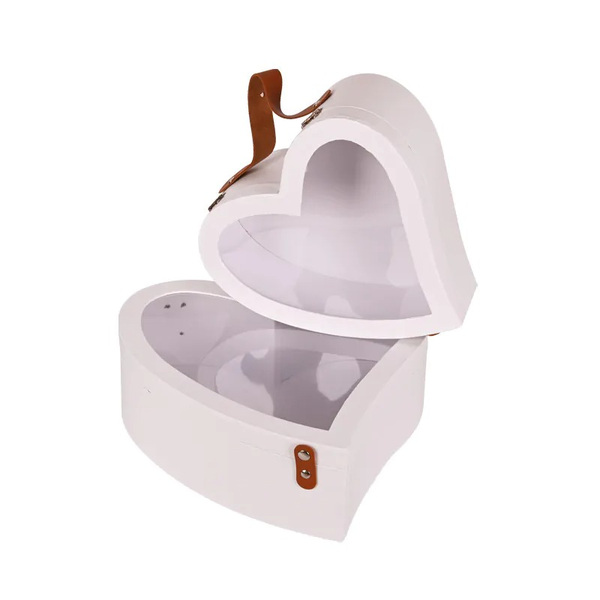 Подаръчна 2 в 1 кутия Сърце с кожена дръжка, прозрачен капак и тик-так кожено закопчаване.