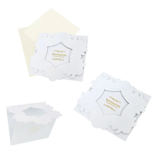 Красива покана, изработена от бял перлен картон с релеф и златист надпис, лист за текст и плик.