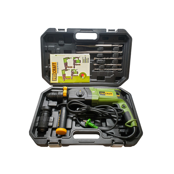Технически характеристики: \nКонсумирана мощност: 900 В \nНоминално напрежение: 220 V, 50 Hz \nОбороти на празен ход (об./мин.): 0-1100 \nЧестота на ударите (уд./мин.): 5300 \nСила на удара: 3.2 J \nТип захващане: SDS-Plus \nДиапазон на пробиване - бетон: 26 мм, метал: 13 мм, дърво: 30 мм \nТегло: 3,5 кг