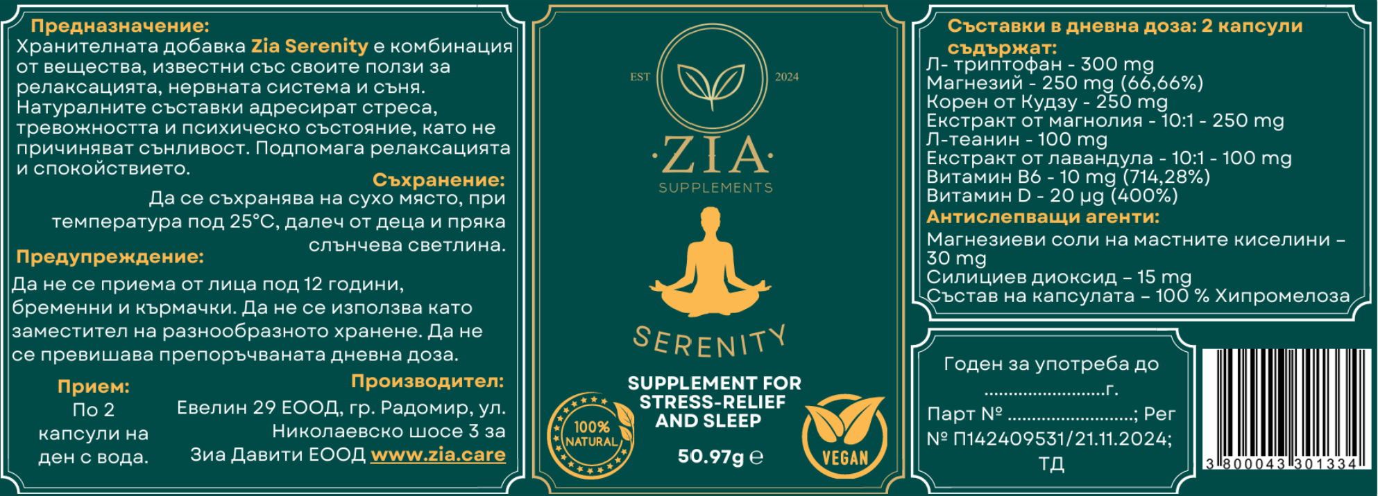 Създаден за съвременния начин на живот, изпълнен със стрес и напрежение, Zia Serenity ви помага да се чувствате отпочинали, енергични и уверени. Независимо дали се борите с хроничен стрес, нарушения на съня или искате да се справите с емоционални предизвикателства, този продукт ще ви осигури необходимата подкрепа. Zia Serenity е натурална добавка, която облекчава стреса, подобрява съня и връща радостта в ежедневието. Тази комплексна формула подпомага нервната система, регулира настроението и предоставя подкрепа при емоционални състояния като: