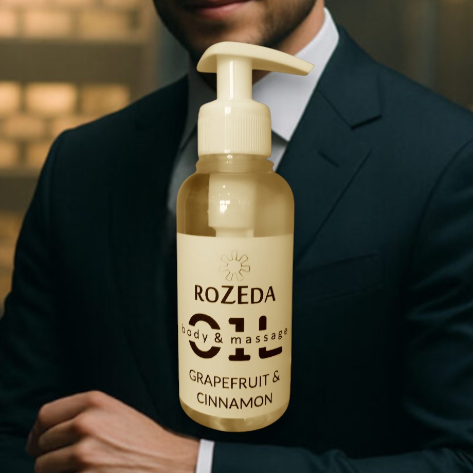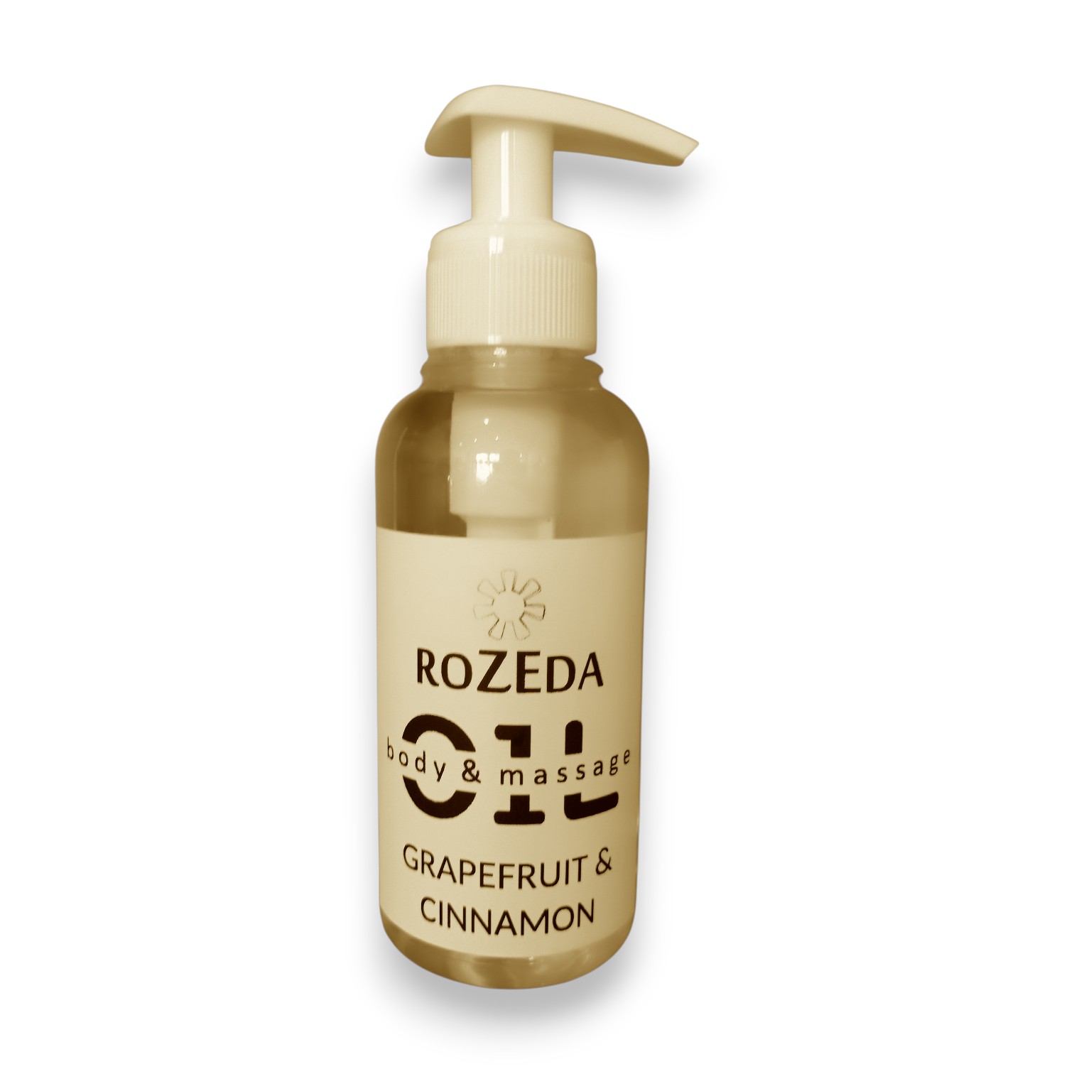 Масажното масло „Грейпфрут и Канела“ е професионално масажно масло с балансирана формула, съчетаваща база от минерално масло с подхранващи растителни масла и деликатен ароматен профил. Основата съдържа още 100% натурални растителни масла, богати на есенциални мастни киселини (омега-6 и омега-9) - масло от Гроздови семки, Сусамово масло, масло от Жожоба, както и вит. Е. Тези съставки допринасят за подхранване, хидратиране и подобряване на еластичността на кожата. Подходящ за всички типове кожа, включително суха и чувствителна.