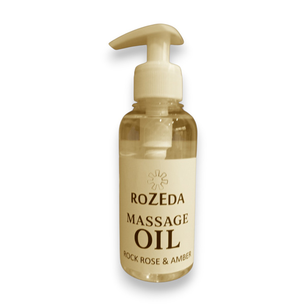 Масажното масло „Скална роза и Кехлибар“ е професионално масажно масло с балансирана формула, съчетаваща база от минерално масло с подхранващи растителни масла и деликатен ароматен профил. Основата съдържа още 100% натурални растителни масла, богати на есенциални мастни киселини (омега-6 и омега-9) - масло от Гроздови семки, Сусамово масло, масло от Жожоба, както и вит. Е. Тези съставки допринасят за подхранване, хидратиране и подобряване на еластичността на кожата. Подходящ за всички типове кожа, включително суха и чувствителна.