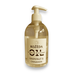 Масажното масло „Грейпфрут и Канела“ е професионално масажно масло с балансирана формула, съчетаваща база от минерално масло с подхранващи растителни масла и деликатен ароматен профил. Основата съдържа още 100% натурални растителни масла, богати на есенциални мастни киселини (омега-6 и омега-9) - масло от Гроздови семки, Сусамово масло, масло от Жожоба, както и вит. Е. Тези съставки допринасят за подхранване, хидратиране и подобряване на еластичността на кожата. Подходящ за всички типове кожа, включително суха и чувствителна.