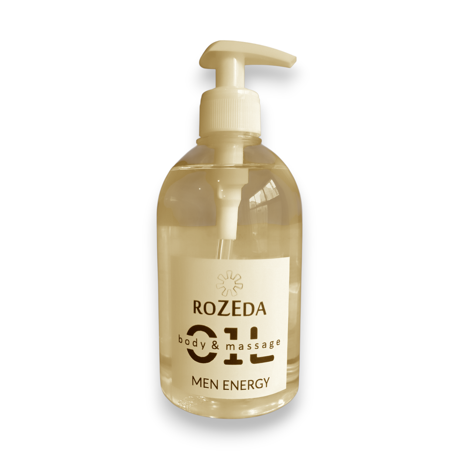 Масажното масло „Мъжка енергия“ е професионално масажно масло с балансирана формула, съчетаваща база от минерално масло с подхранващи растителни масла и деликатен ароматен профил. Основата съдържа още 100% натурални растителни масла, богати на есенциални мастни киселини (омега-6 и омега-9) - масло от Гроздови семки, Сусамово масло, масло от Жожоба, както и вит. Е. Тези съставки допринасят за подхранване, хидратиране и подобряване на еластичността на кожата. Подходящ за всички типове кожа, включително суха и чувствителна.