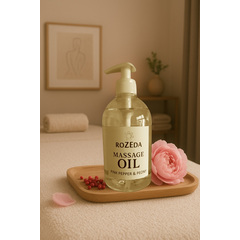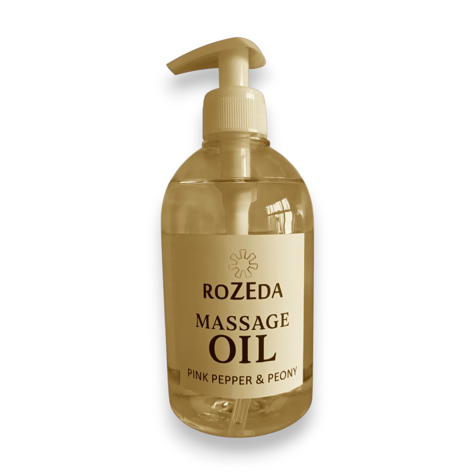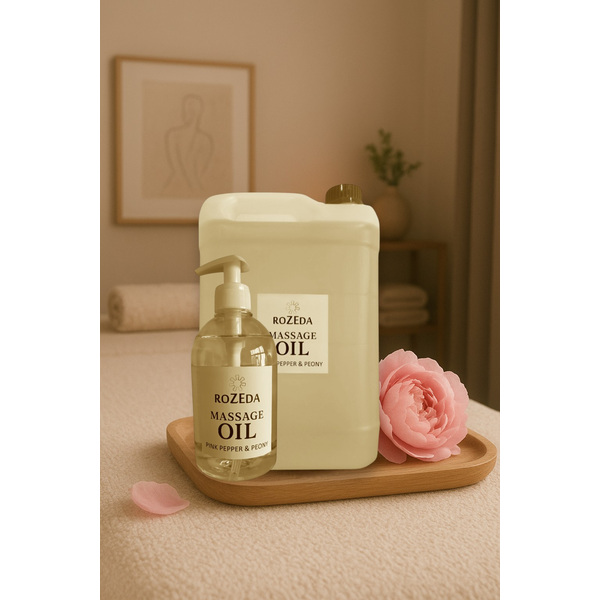 Масажното масло „Розов пипер и Божур“ е професионално масажно масло с балансирана формула, съчетаваща база от минерално масло с подхранващи растителни масла и деликатен ароматен профил. Основата съдържа още 100% натурални растителни масла, богати на есенциални мастни киселини (омега-6 и омега-9) - масло от Гроздови семки, Сусамово масло, масло от Жожоба, както и вит. Е. Тези съставки допринасят за подхранване, хидратиране и подобряване на еластичността на кожата. Подходящ за всички типове кожа, включително суха и чувствителна.