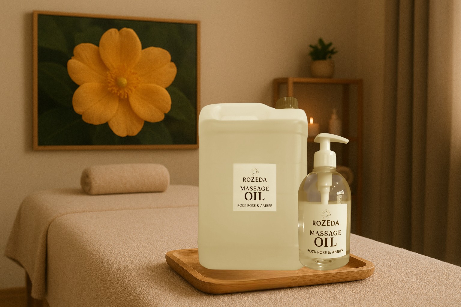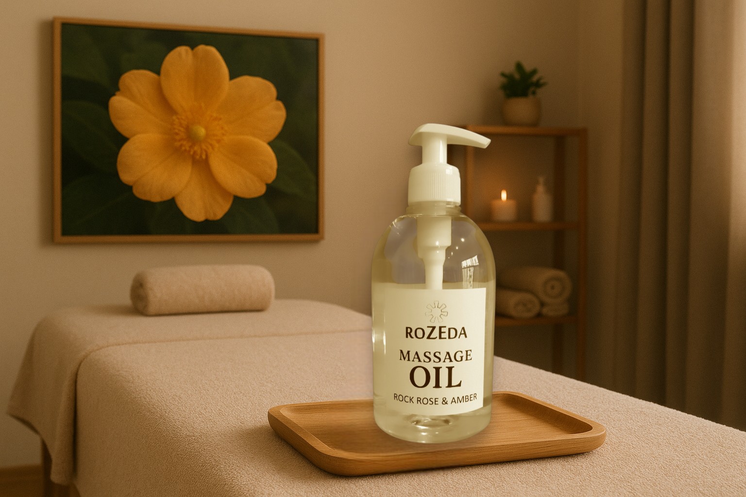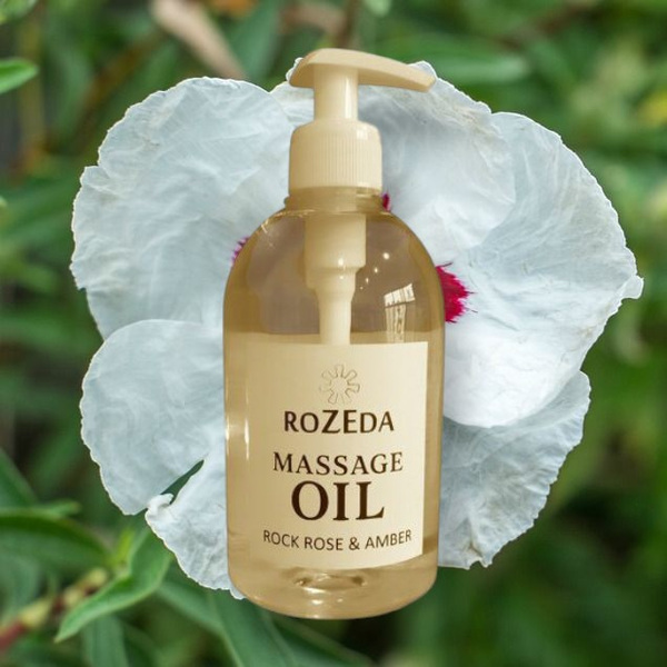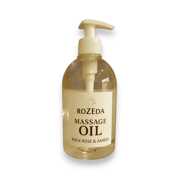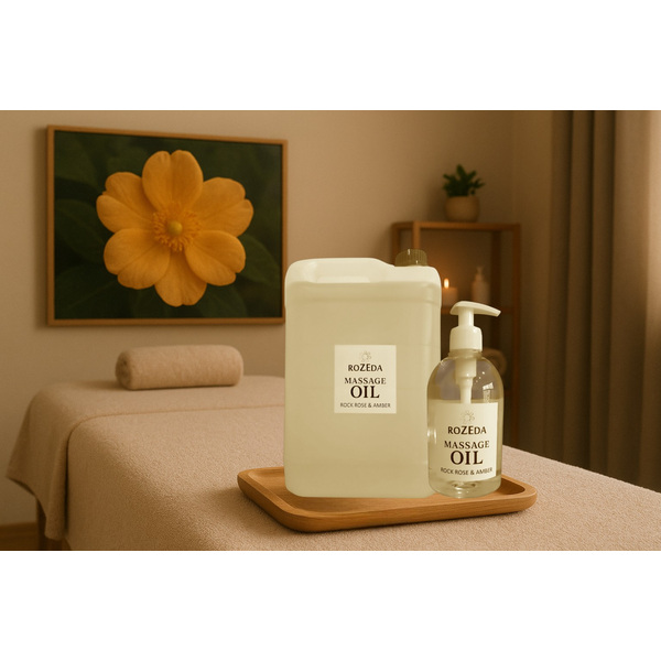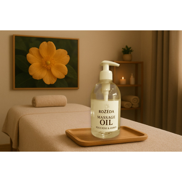 Масажното масло „Скална роза и Кехлибар“ е професионално масажно масло с балансирана формула, съчетаваща база от минерално масло с подхранващи растителни масла и деликатен ароматен профил. Основата съдържа още 100% натурални растителни масла, богати на есенциални мастни киселини (омега-6 и омега-9) - масло от Гроздови семки, Сусамово масло, масло от Жожоба, както и вит. Е. Тези съставки допринасят за подхранване, хидратиране и подобряване на еластичността на кожата. Подходящ за всички типове кожа, включително суха и чувствителна.