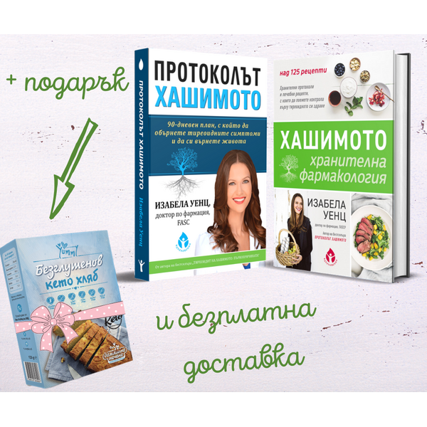 Изабела Уенц , доктор по фармация, FASCP, е фармаколог, пациент с хашимото и пионер в областта на промените в начина на живот, необходими при тиреоидит на Хашимото. Вземи две от най-практичните ѝ книги с подарък – вкусно КЕТО хлебче за домашно печене. Протоколът Хашимото включва конкретни протоколи, истории за успехи и рецепти, които можеш да използваш, за да си върнеш здравето. Включва 90-дневен план, за намаляване на тиреоидните симптоми и възвръщане на енергията в живота. Но не само! Където и да се намирате в пътуването си, искам да знаете, че нещата може да се подобрят и че вие ще се почувствате по-добре, стига да се ангажирате да поемете отговорност за собственото си здраве и да направите промени във вашия живот. Тази книга е една отлична първа стъпка. За мен е чест да бъда част от пътуването ви! Хашимото: хранителна фармакология Една готварска книга, написана за хора, които не са специалисти по хранене (нутрициолози), нито са шеф-готвачи. Тя е предназначена за хората, които са готови да поемат отговорност за собственото си здраве. Книгата е лесен за използване и добре организиран наръчник, който предоставя средствата и увереността за оптимизиране на храненето и осигурява рецепти за вкусни ястия, които не изискват целодневен престой в кухнята. Изцяло съобразена с " Протоколът Хашимото " Можем да използваме храната като свое лекарство по същия начин, по който използваме фармацевтичните препарати, за да повлияем на биологията си. Наричам тази концепция хранителна фармакология. Храната може да бъде ваш мощен съюзник по пътя ви към излекуването и точно както се стараете да се уверите, че медикаментите, които приемате, са подходящи за тялото ви, добре би било да изградите диетата си така, че да получите най-добрите резултати. Повече за КЕТО хлебчето и другите безглутенови продукти на Yummy Natural виж тук .
