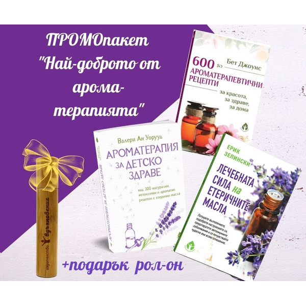 Поръчай промопакет „Най-доброто от ароматерапията“ тук и вземи подарък – уникален бамбуков рол-он за първите ти ароматни занимания. Идеален е за дамската чанта. Можеш да го носиш навсякъде с теб, без да се притесняваш, че може да го счупиш. Поръчай пакета тук на цена 59 лева и вземи подарък бамбуков рол-он (на цена 8.99лв.). Промопакетът включва книгите: „ Лечебната сила на етеричните масла “ от д-р Ерик Зелински „ 600 ароматерапевтични рецепти за красота, за здраве, за дома “ от Бет Джоунс „ Ароматерапия за детско здраве “ от Валери Ан Уорууд И идва при теб с подарък бамбуков рол-он