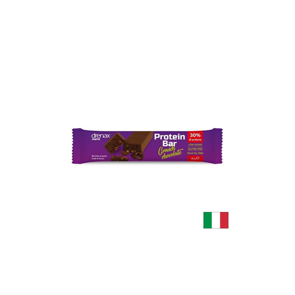 Drenax forte Protein Bar – Crunch chocolate от серията продукти на италианския бранд Paladin Pharma e протеинов бар с вкус на тъмен шоколад, с 30% протеин, с ниско съдържание на захар, без палмово масло и без глутен. Перфектен за тези, които търсят вкусна и питателна закуска с висококачествен протеин.
