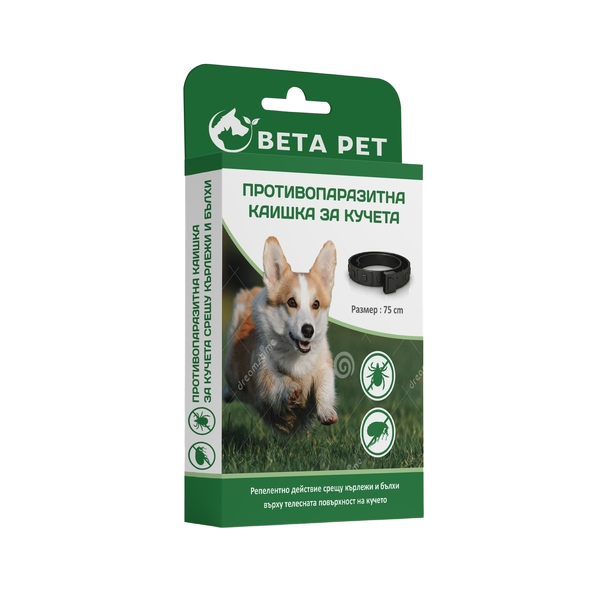 Продуктът е предназначен за кучета.Размер: 75 см. Продукт за предотвратяване и елиминиране на кърлежи и бълхи по телесната повърхност на домашния любимец.BETA PET използва ново решение със силиконова технология, която поставя физическа бариера срещу паразитите. Функционира като ги обездвижва и унищожава. Осигурява безопасна, нетоксична, дългосрочна и ефективна защита. Кърлежите и бълхите не могат да развият резистентност, тъй като продуктът не е инсектицид.Предназначен e за защита от кърлежи и бълхи, за здрави израснали животни на възраст над два месеца.Преди употреба отворете херметически затворената вътрешна опаковка и извадете каишката. Поставете я около врата на домашния любимец, така че два пръста да могат да се поберат под каишката. Закопчайте каишката и изрежете висящата част. Преди да къпете животното, свалете каишката и я сложете отново само след като кожата и козината му са изсъхнали. Отстранявайте имобилизираните паразити чрез разресване на козината. Непрекъснатото използване на каишката осигурява защита срещу кърлежи за 45 дни и бълхи за 90 дни. При температури над 35°C, ефикасността е гарантирана само за 45 дни.