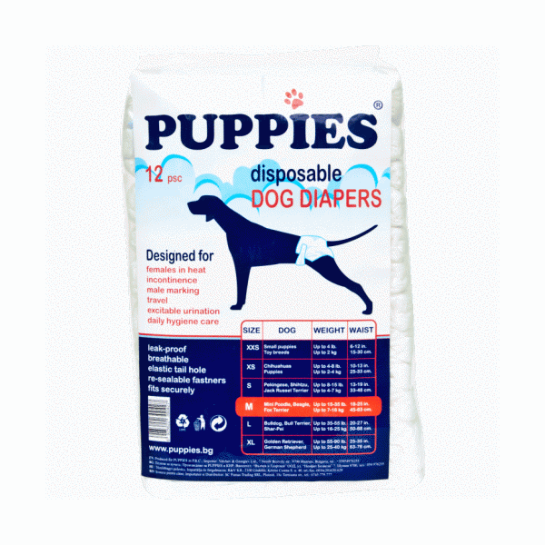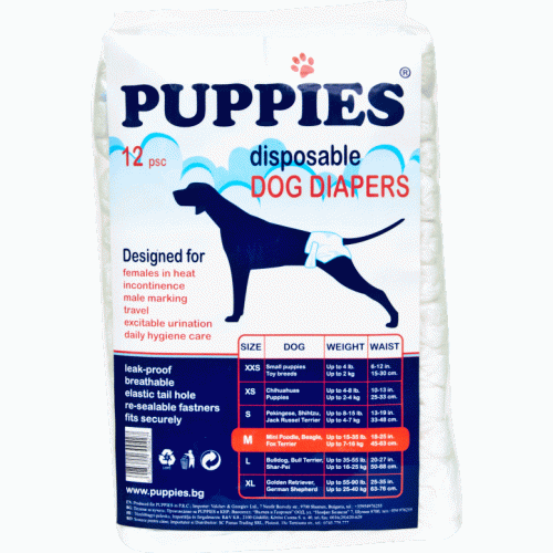 Puppies M - памперс-гащи за кучета с тегло 7-16 кг. и талия 45-63 см.,12 броя